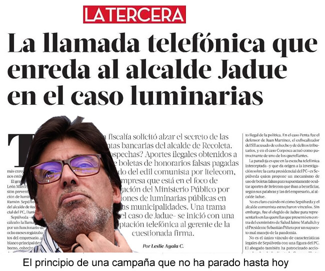 Los días 9, 11 y 12 de enero de 2021, La Tercera inició la andanada, con tres artículos, La llamada telefónica que enreda al alcalde Jadue en el caso luminarias; Cuatro preguntas sobre las luces de Jadue y Caso Luminarias LED: las 11 aristas paralelas que lleva adelante la fiscalía, firmados por Leslie Ayala.