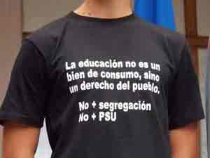 Aunque estaba nervioso y pensaba que los guardias podrían bajarlo de la tarima, Ilari se subió con la polera a recibir el diploma. “La educación no es un bien de consumo, sino un derecho del pueblo. No + segregación. No + PSU”, se leía en letras blancas sobre la tela negra.