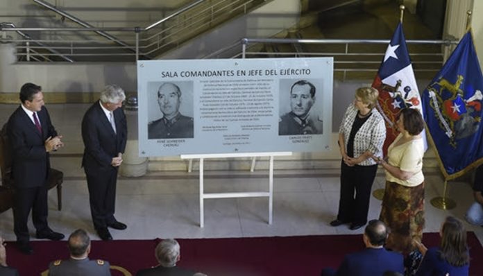 En el quinto piso del edificio del Ministerio de Defensa Nacional , donde estuvieron las oficinas de los comandantes en jefe del Ejército, la Mandataria develó una placa conmemorativa que busca reconocer la figura de los dos militares constitucionalistas y que se enmarca en las actividades de memorialización del Primer Plan Nacional de Derechos Humanos, presentado el pasado 22 de diciembre.