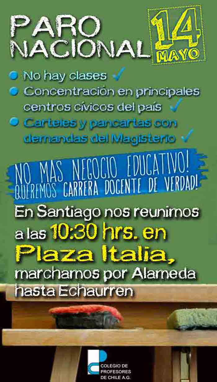 El Presidente del Colegio de Profesores, Jaime Gajardo, señaló que a la jornada de paro nacional del jueves 14 de mayo, convocada por el magisterio, «se han unido organizaciones de secundarios, universitarios, apoderados y trabajadores de la educación. Será la primera movilización de carácter unitario de este año para llamar al gobierno a escuchar a los movimientos sociales. Es ahí donde están las mayorías.»