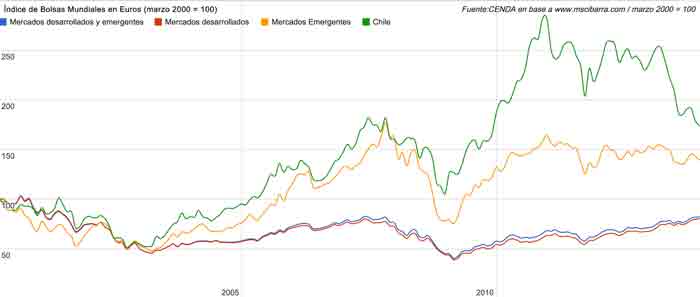 Estas notas vienen publicando regularmente la comparación, en el curso de la crisis secular que se inició junto con el siglo, de la bolsa chilena con las emergentes, los países desarrollados y el conjunto de las bolsas mundiales, todas medidas en Euros.